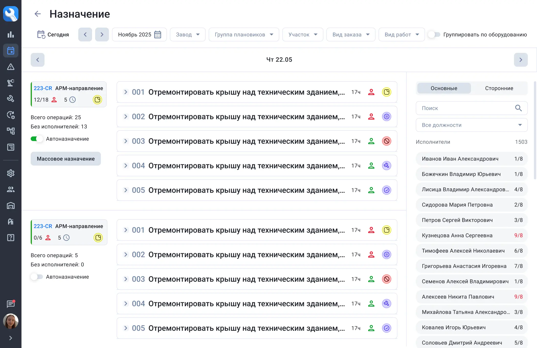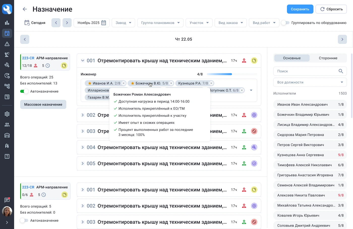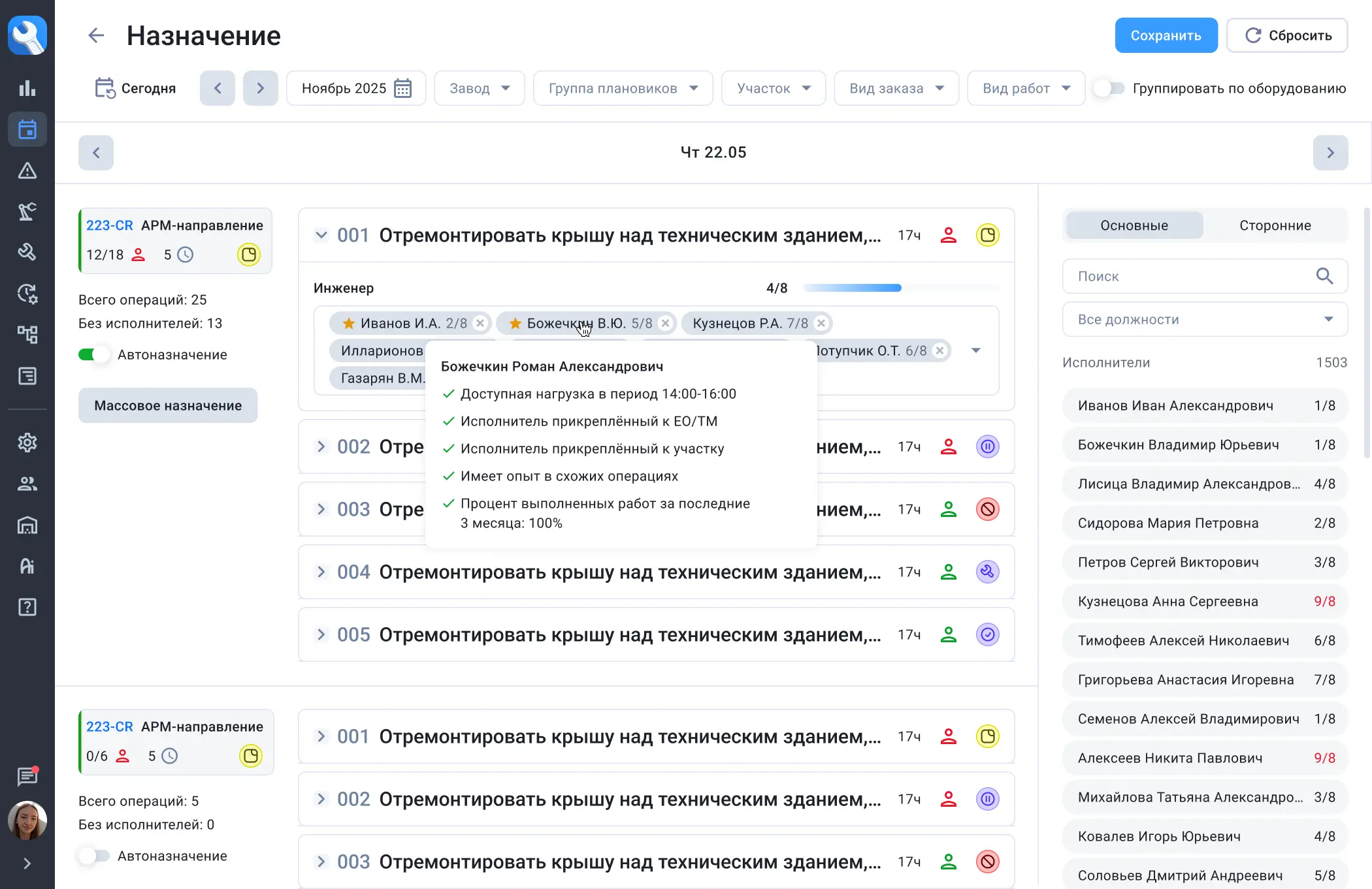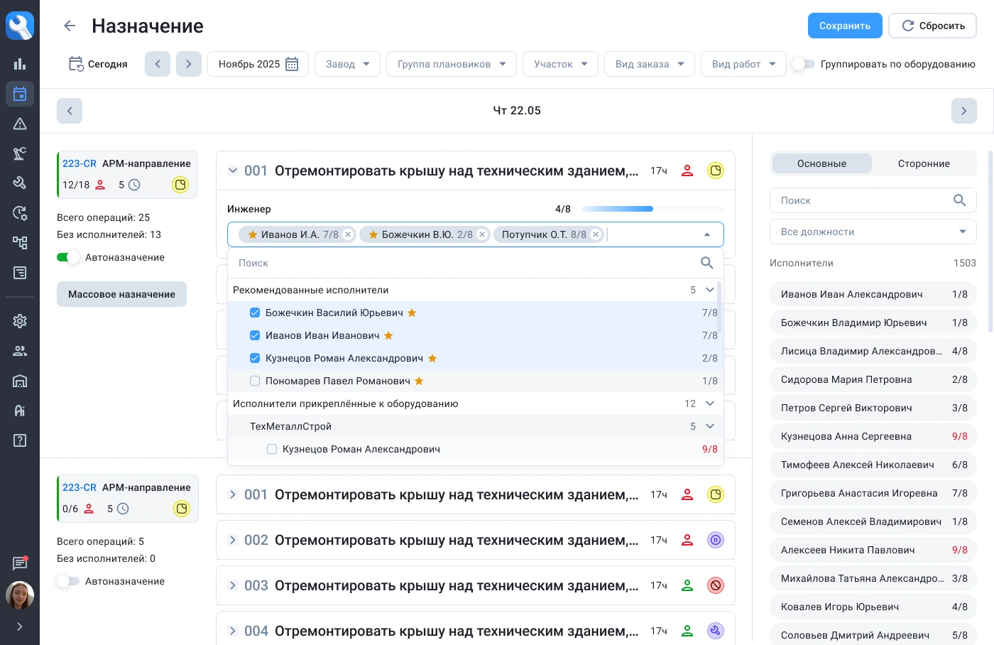 - Назначение исполнителей на операции заказов в соответствии с должностью и их доступностью