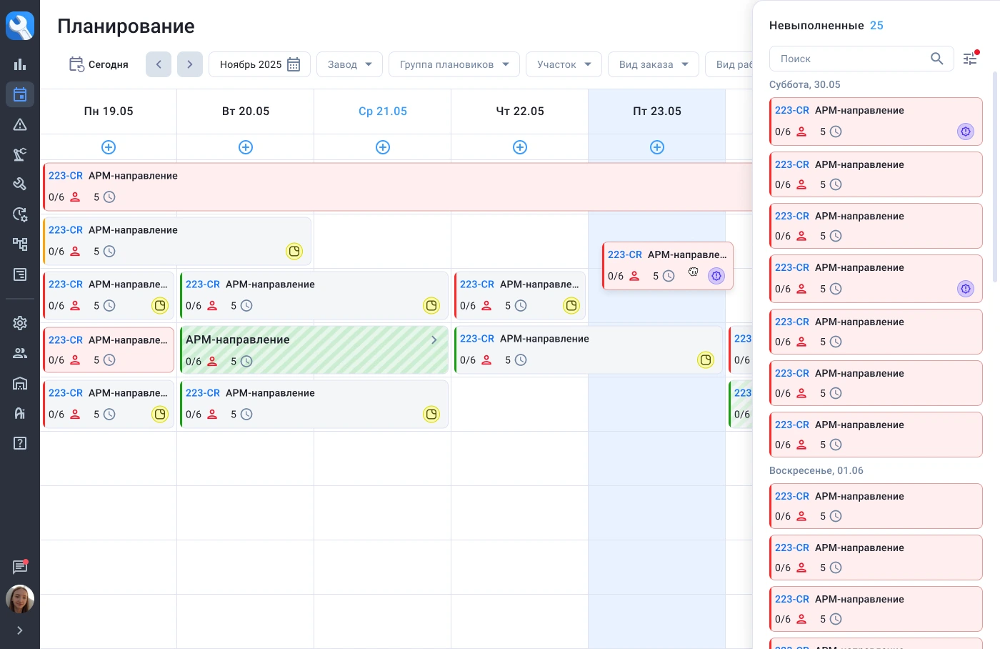 - Планирование и просмотр графика работ на недельном горизонте, фильтрация и группировка заказов