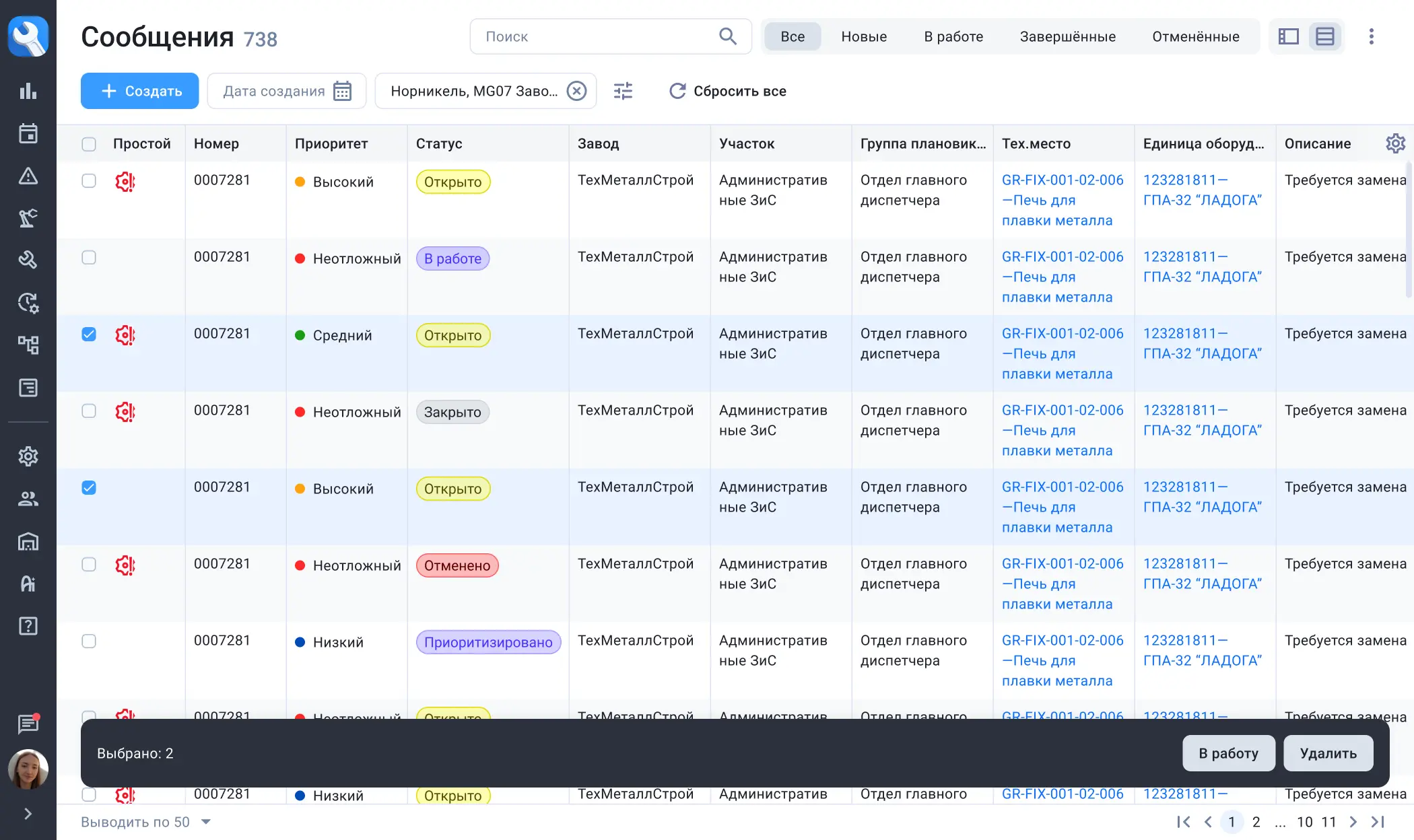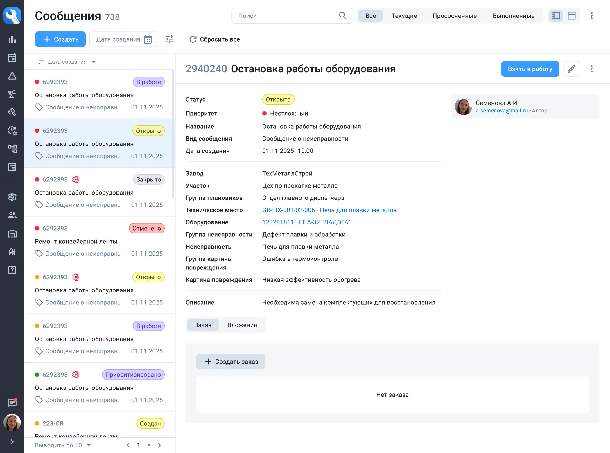 - Просмотр списка сообщений о неисправностях и заявок на обслуживание