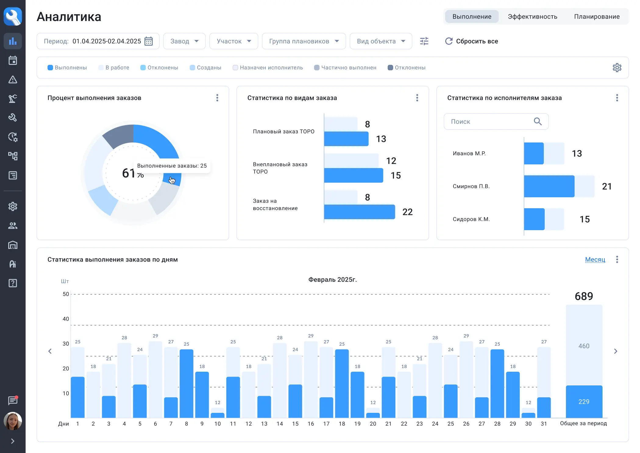 Единая модульная платформа со встроенными искусственным интеллектом для управления всем циклом технического обслуживания и ремонта — от стратегического планирования и графиков ППР до выполнения ежедневных задач: обходов, осмотров, регистрации заявок и ремонтных работПродукт