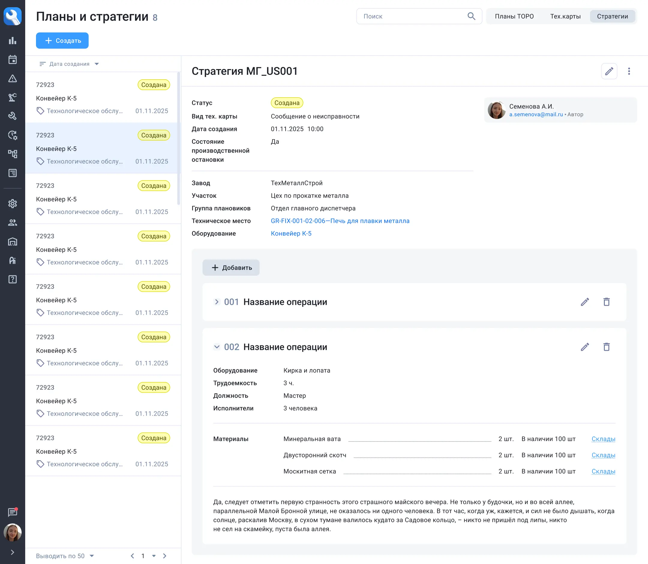 Ведение базы данных оборудования, создание и ведение справочников ТОиР, корректировка технологических карт и планов ТОРО