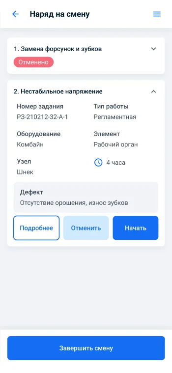 - Повышение качества фиксации результатов работы за счет возможности ввода факта списания ТМЦ, обработки подопераций
